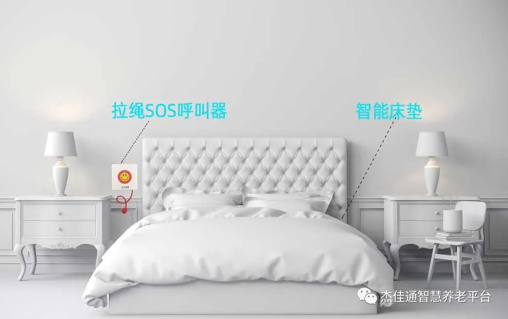 1、床頭安裝拉繩SOS呼叫器,當老人在床上感到不舒適時,可以通過拉繩或者按下呼叫器按鈕,把求助信息發(fā)送到值班中心或者子女手機上,值班中心電話會響起,同時值班中心大屏上即時顯示老人的信息,子女手機上也同時受到老人異常信息的推送。