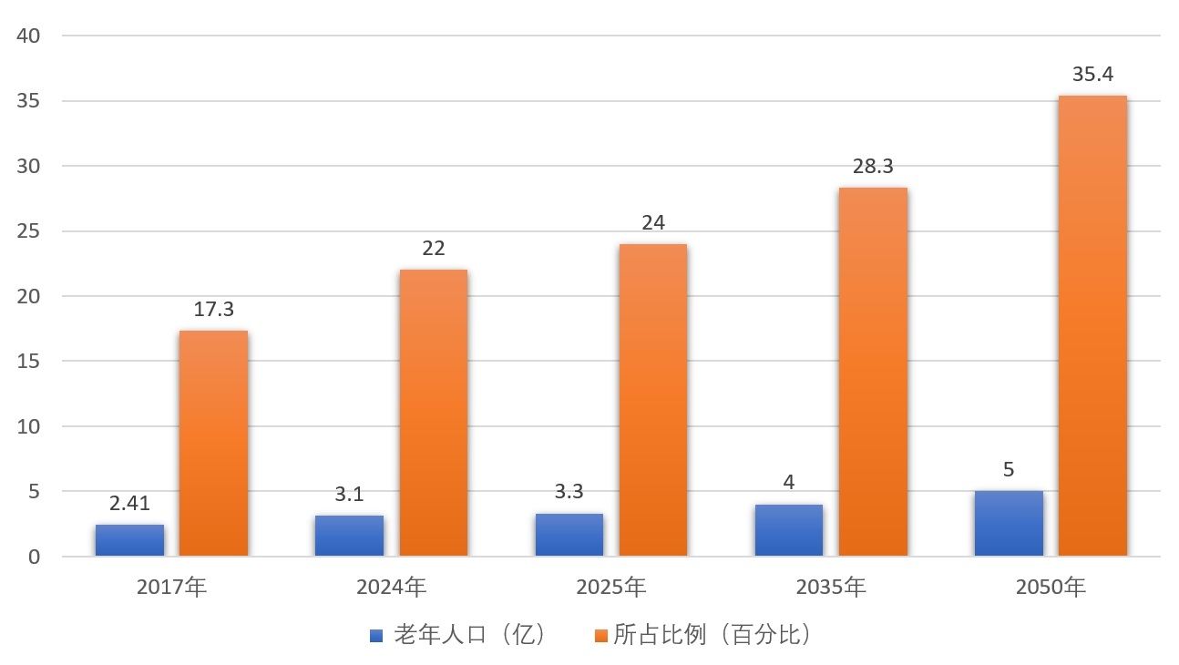 我國確立了“以居家為基礎、社區為依托、機構為支撐”的養老產業框架和9073養老格局,90%居家養老;2025年1月17日,國家統計局發布,截至2024年底,我國60歲及以上老年人口有3.1億人,占總人口22%,其中,65歲及以上人口超2.2億人,占15.6%。2035年左右我國60歲及以上老年人口將突破4億,在2050年前后達到頂峰,約占總人口的1/3。那時,中國將有4.8億、甚至接近5億老年人,是世界上老年人口最多的國家。養老服務業目前已達20萬億市場規模。
